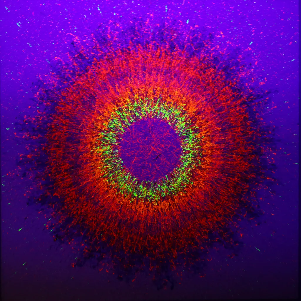 Another important assumption, on which the creation of my works of art is based, is to show the duality of nature. The human nature and nature in general. Just as there is good and evil, light and dark, spirit and matter, each of my paintings from the Quantum Epicentre series has two different faces. One of them is visible in a day light, but the other can only be seen when illuminated with ultraviolet light. In this case, the idea of creating the paintings was inspired by Planck’s philosophy, destroying the traditional theory of the wave structure of light radiation in favour of its quantum character. Or rather, an introduction to the physics of the concept of chaos theory. Hence the second part of the name of the series of my works, Quantum, which in a very simplified manner, could be called Radioactive Works.