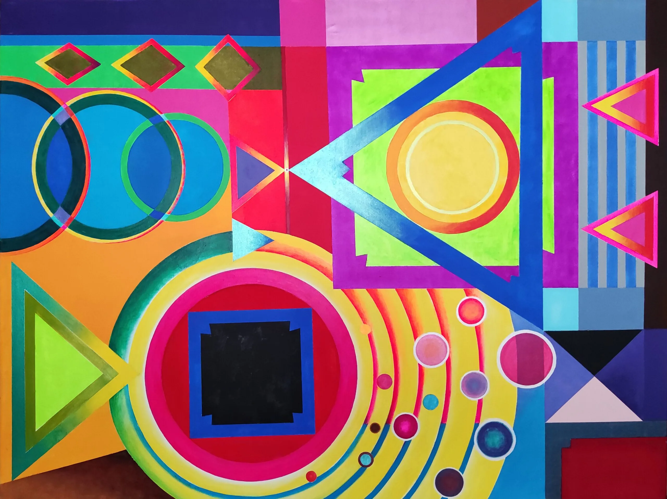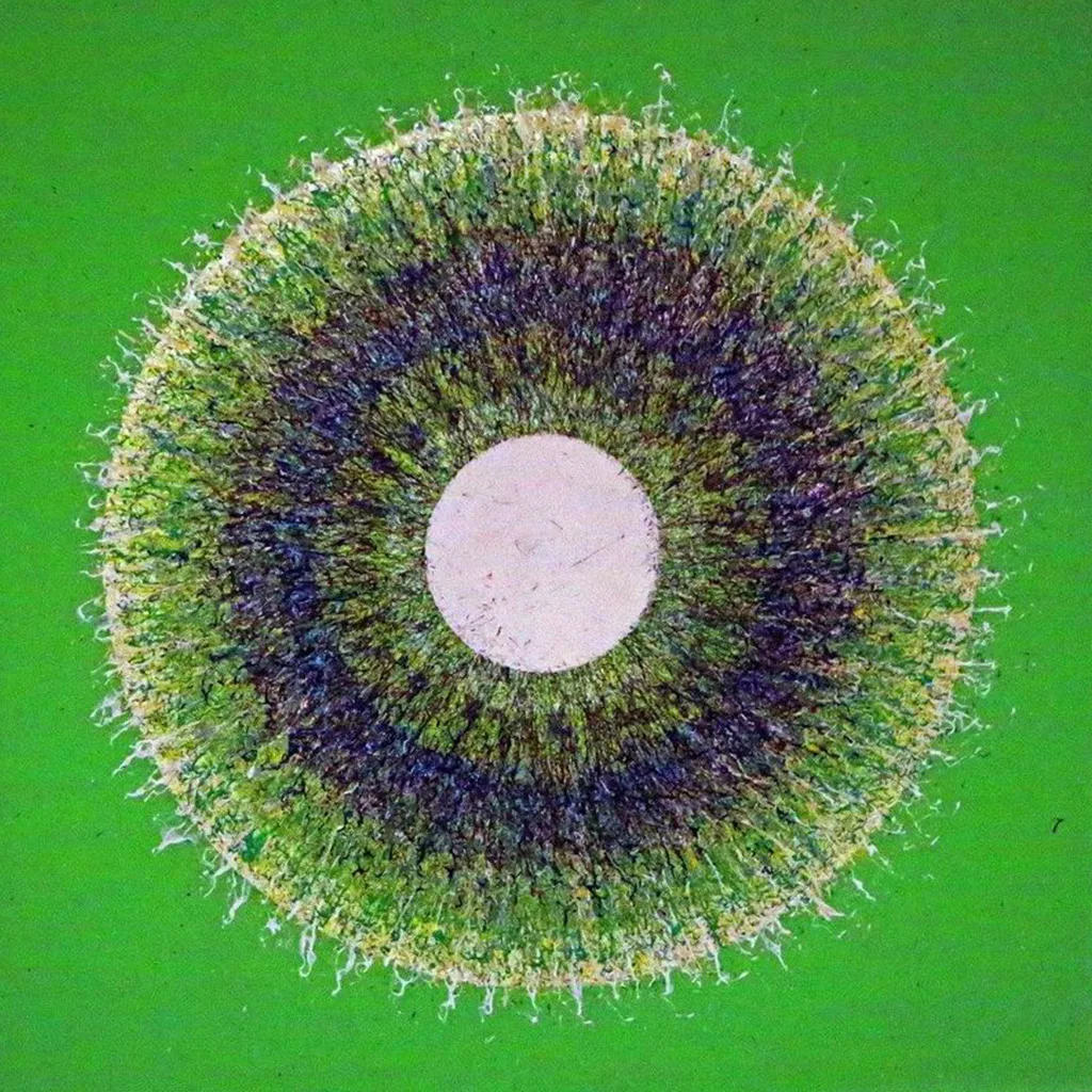 It is also my intention to show how much energy can be released in a limited and simplest form, which is a circle. It would seem that a geometric figure is a stable, unshakable form, limited by its edges, unambiguously outlined. However, each figure, through its marking, is detached from the ground and someone’s will from which it was created, what also resulted in a certain charge of energy. Filling this form with colour, further intensifies this energy. Adding paint to this directional position builds up the tension and makes the assumed geometric figure, strictly defined, unshakable to live its own life.